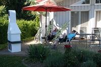 im Liegestuhl und hört Musik, Betty schreibt Karten und ich auf dem Laptop das