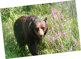 sehen einen Braunbären, wie er sich genüsslich am Laub eines Busches den